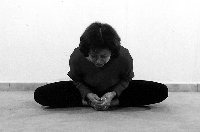 Descendre le dos le plus droit possible, les coudes appuient à l’intérieur des cuisses. Dans cette deuxième phase on peut rester sur le même souffle ou développer des rétentions à poumons vides (1-2-4) en se concentrant sur les centres du bas (Base – Pubis). Faire le même nombre de souffles 3-5-7 ou 9 souffles. Inspire, remonter le buste, se replacer dans la première position et finir sur une ou trois respirations. Quitter la pose en expirant.