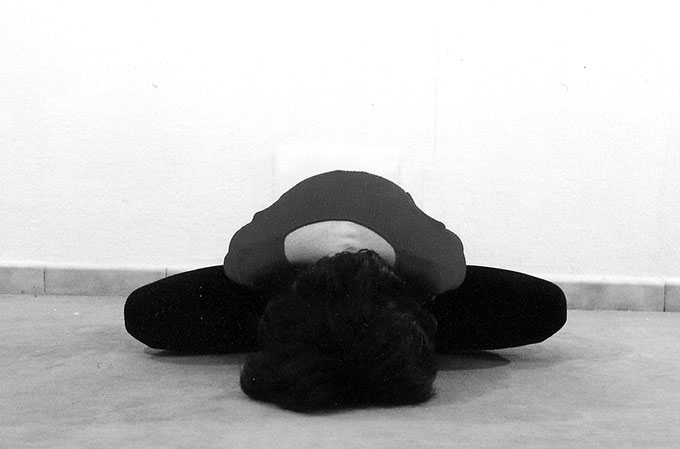 Rythme 1-4-2 dans la colonne en faisant le lien entre la base et le front, 3-5-7 ou 9 souffles. Sur une expiration plier les bras, les coudes vers l’intérieur des cuisses, et descendre le buste vers le sol de façon à approcher le front du sol.