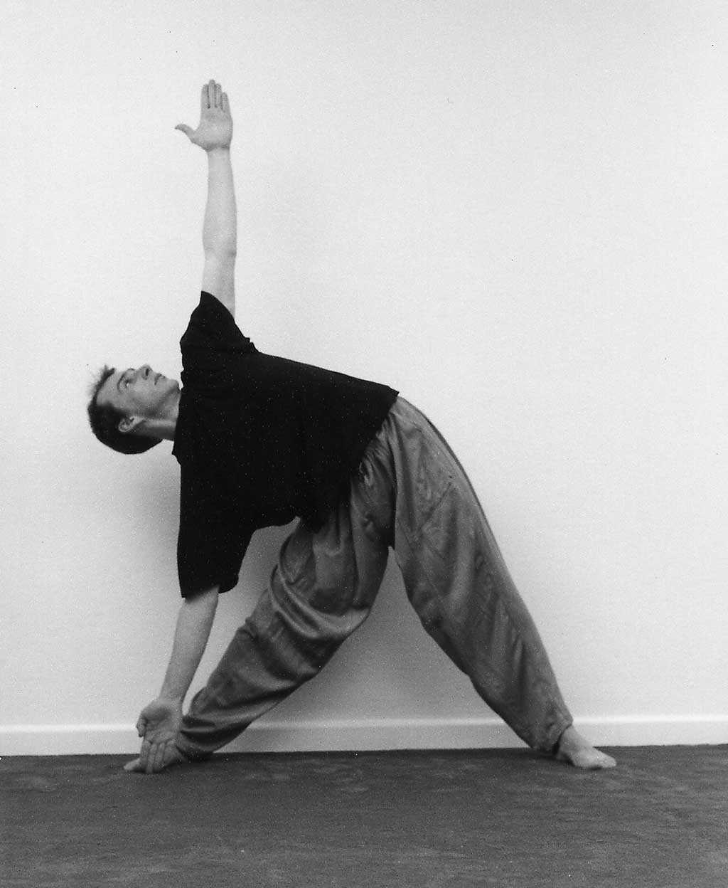 Pieds écartés, mains jointes devant la poitrine, sur une expiration se pencher en avant en fixant un point en face. Sur une inspiration se redresser en ouvrant les bras de chaque coté sur une expiration descendre la main droite vers le pied droit, faire un appui léger du bout des doigts , tourner en même temps la tête et le regard vers le plafond le plus à l’aplomb possible en essayant d’ouvrir au maximum les épaules et le thorax.