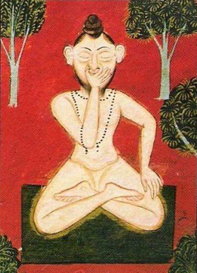 en posture assise, main gauche sur le genou gauche en cin mudra, pouce et index joints (vers le bas) ou jnana mudra (vers le haut).